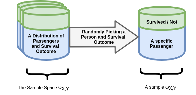 In this step, we will define the process which generates the data, usually in a probabilistic manner. For now, we will choose to describe the process as some back box which randomly spits out pairs of some passenger parameters and an indicator of whether this passenger has survived or not. An important assumption we make on the process is that different outcomes are statistically independent.