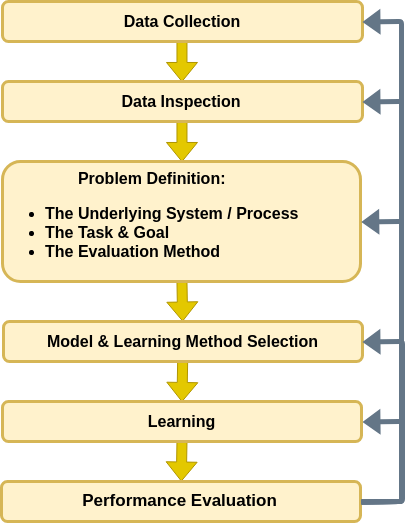In our problem, we will only work with pre-collected datasets, and won't discuss this step at all. It is, however, vital to understand that this step is an integral part of the process and in many cases will be evolving over time to better fit the needs of the system.